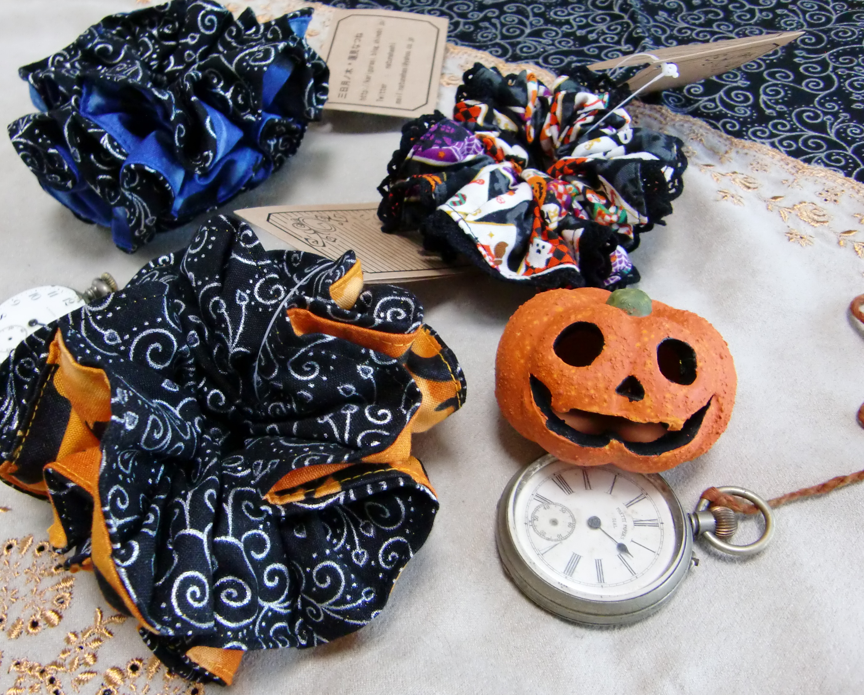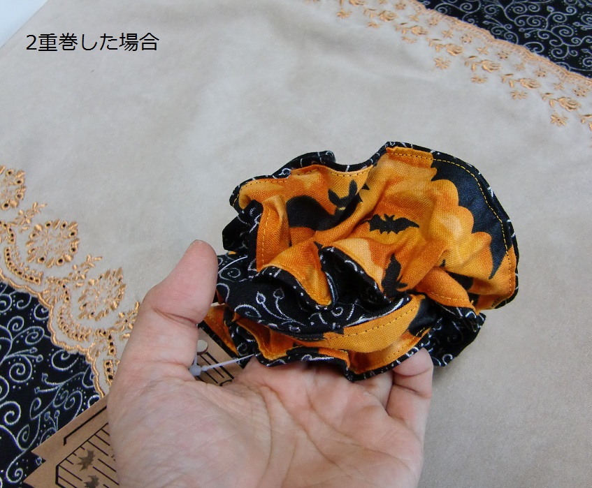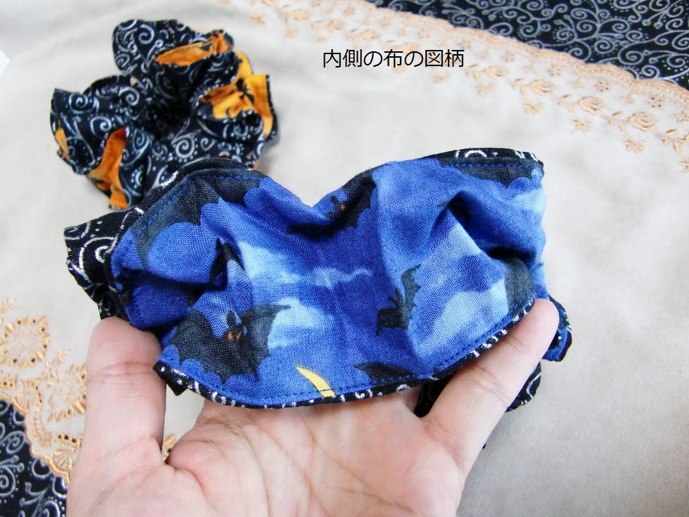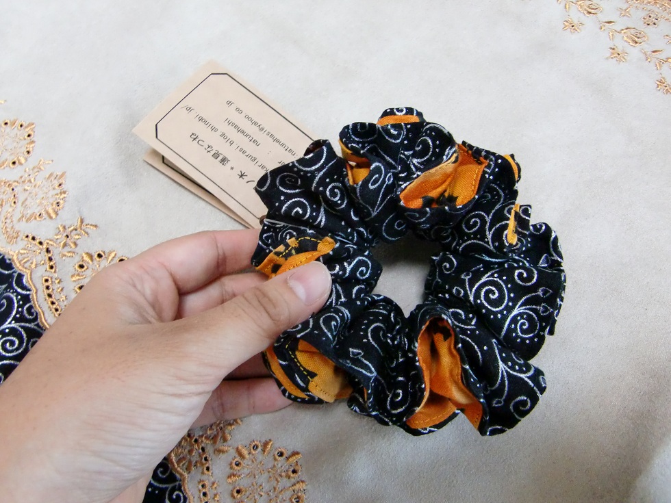 ハロウィンをイメージした黒地に銀ラメ×コウモリ柄のシュシュです。